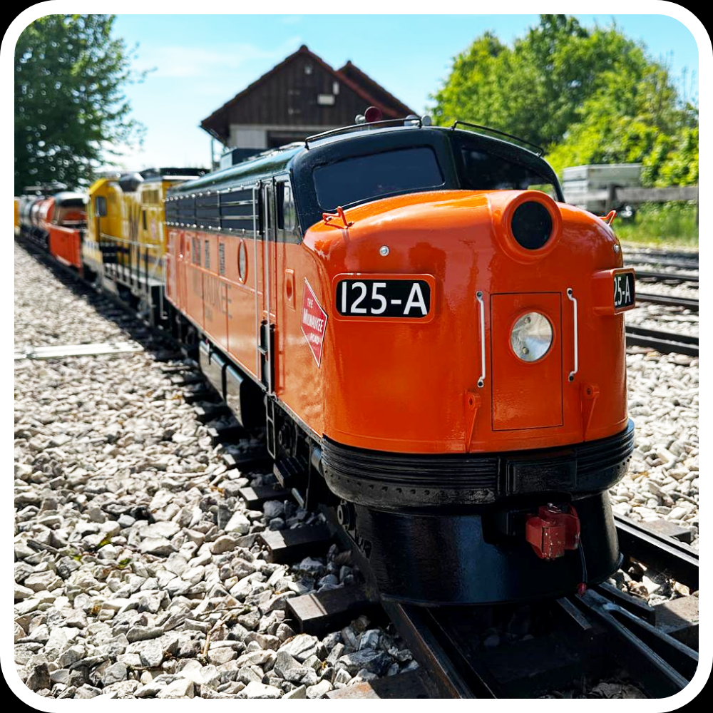 Modelle 4-8-2 Mountain-Chesapeake and Ohio Railway - Bj1989- Besitzer Christian Stumpe - Firma OS Livesteam Br. 17/ Preußische S10 Besitzer Jan Uhlshöfer Erbauer-Ralf Peter Stolle Bj. 1999 Preußische Staatseisenbahnen SD70ace-Norfolk Southern Railway-Erbauer-Christian/Reinhard Stumpe 1/12 BJ-2022 Br. 75 6686 Besitzer Jan Uhlshöfer Kleinbahnabteilung des Provinzialverbandes Sachsen Hersteller Daniel Haeger Bj 2022 Br.89 704 Besitzer Timo Zeller - Bj 2006 Knupfer Bausatz KÖF 2 Besitzer Timo Zeller Erbauer Manfred Weinert BJ 2018 V100 003 Besitzer Michael Weber Erbauer Nicky Bodach BJ 2020 Deutsche Reichsbahn 2-6-0 Mogul C&R RR Erbauer Reinhard Stumpe Besitzer Christian Stumpe Bj 2005 Firma OS Live Steam Br.81 028 Erbauer Manfred Weinert BJ 1991 140kg EMD GP40-2 3014 Alaska Railroad- Erbauer Alexander Rudin-Bj 2021 4-4-2 Atlantic 3001 Southern Pacific- Besitzer Marc Bildingmaier-Michael Weber EMD F7 A-Unit "Milwaukee Road Erbauer Alexander Rudin Bj 2024 MK 5001-Milwaukee Road Erbauer Alexander Rudin US Switcher - C&R RR - Erbauer: Reinhard Stumpe Besitzer: Christian Stumpe Bj 2005
